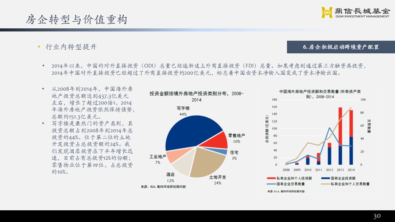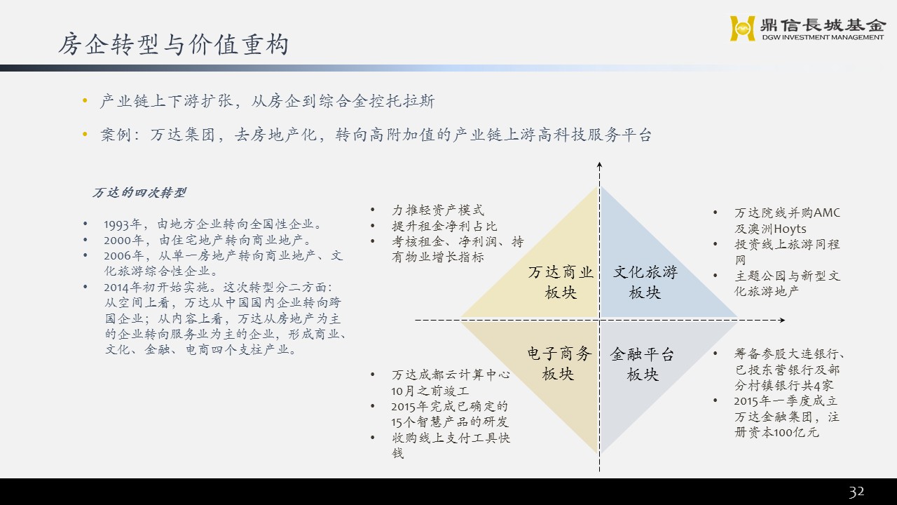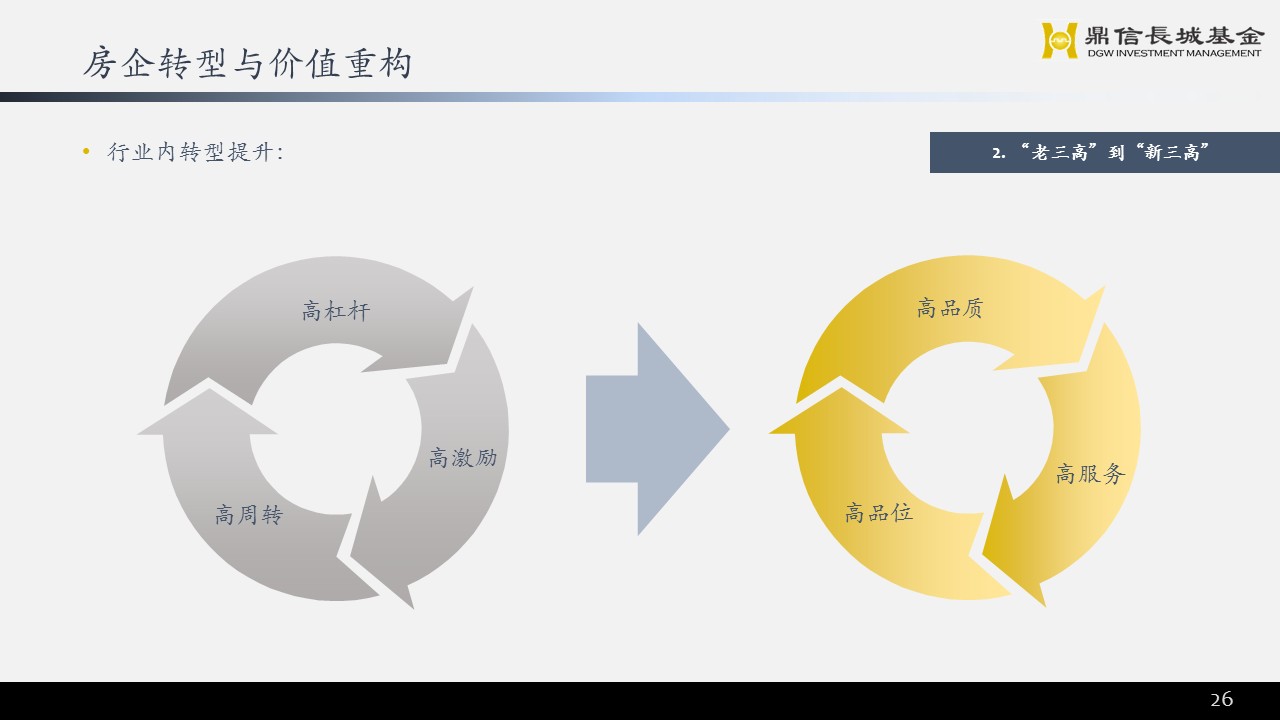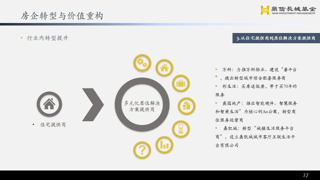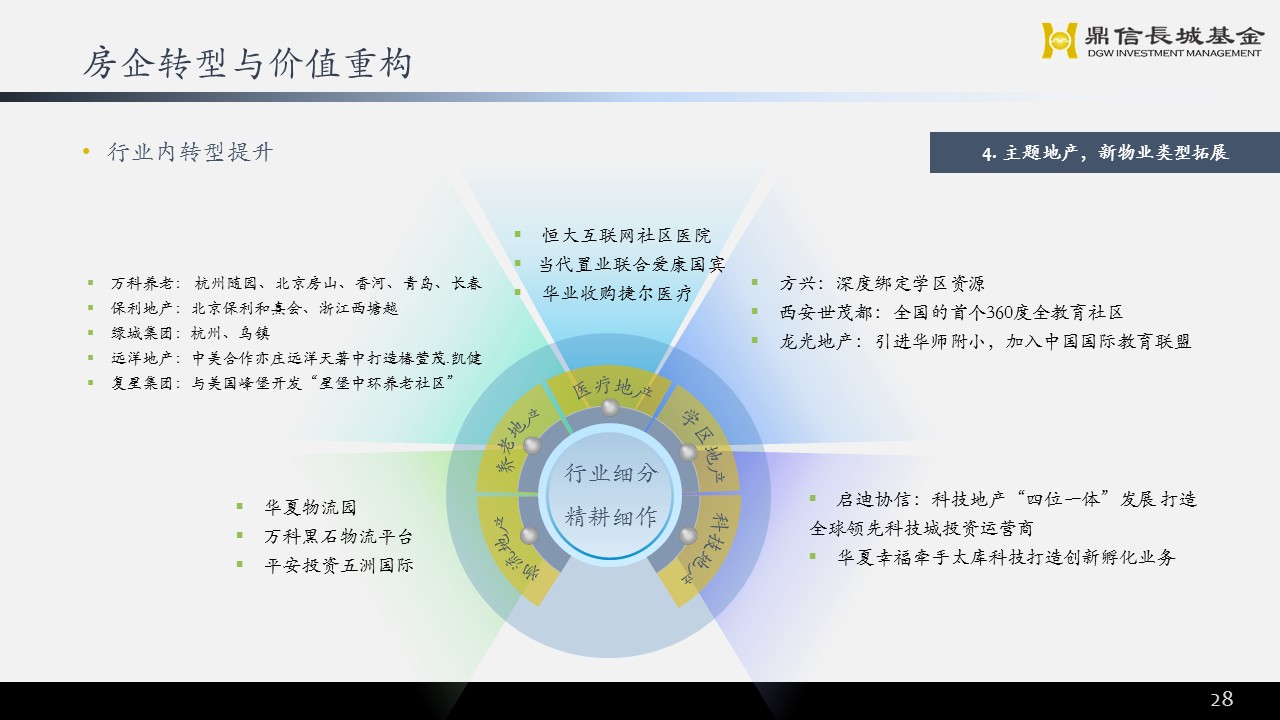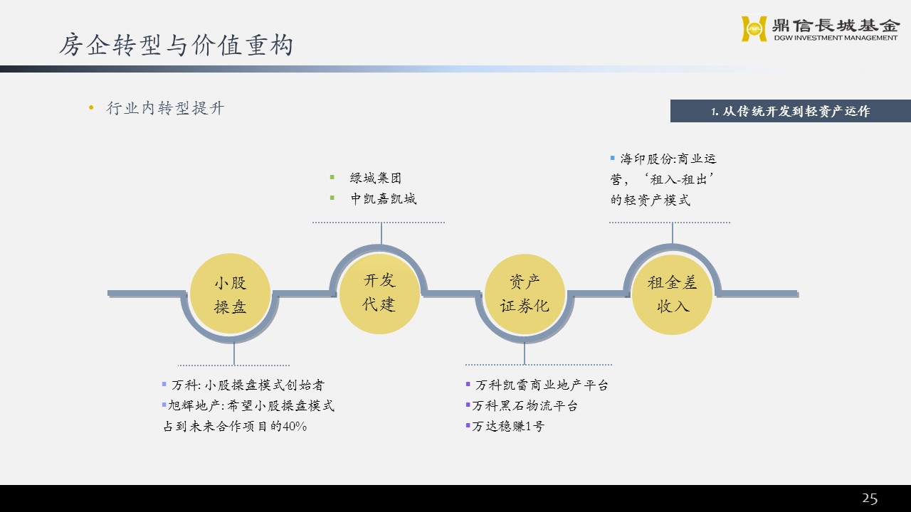 房企如果还是传统的以开发为主,现金流是受到质疑的。如今房企的价值要作出改变的话,首先要把单纯的开发变成持续稳定的收益,比如商业的收益、办公的收益,然后也可以尝试资产证券化。这是从收益的结构来看,如何挖掘房企的价值。