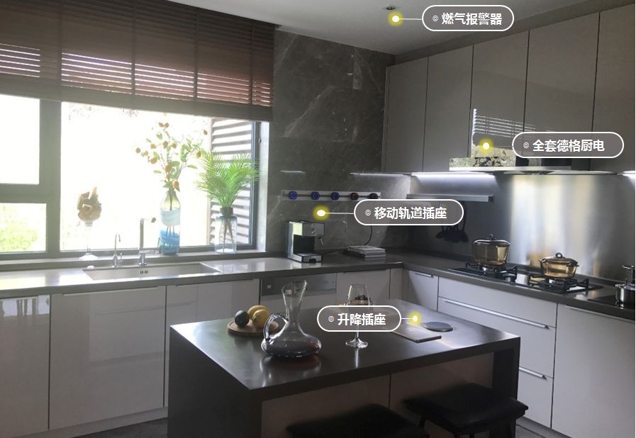 细节之处是在厨房里安装凉霸,不但可以降低烹饪温度还能有效驱散油烟当中的肺部致癌物DNP,确保了皮肤和身体的健康,即便是炎炎夏日也能气定神闲地享受为家人烹饪大餐的愉悦感。同时,厨房里还配备了蓝牙立体音箱,在音乐陪伴下让烹饪成为幸福时光。可移动轨道插座和导台升降插座则可根据实际需求,调整小家电需要的距离和数量,同时打造多种美食。