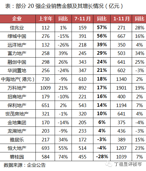 我们来看一下绿城今年的销售业绩,上半年合约销售276亿元,同比减少15.1%,完成全年目标的42.5%,下半年五个月销售额391亿元,同比增长55.8%,目前已超额完成全年销售目标。其中10月份的销售额更是创造记录,达159亿元,11月虽然有所下滑,但是仍然是全年第二高。虽然当中有市场本身的因素,特别是10月以来的整体回暖,有城市自身的因素,杭州限购的取消和阿里的上市,但是我们更应该看到绿城全新的管理团队在这当中付出的心血和汗水,并不是简单的价格策略就一定能把房子卖掉,多少企业三季度以价换量,最终也没换来多大的销量。但是今天绿城的管理团队,实实在在让绿城今年下半年的增长位列前20强第二名。仅从这点来看,必须要给他们点个赞。