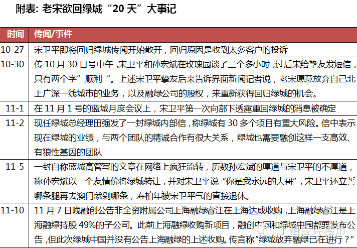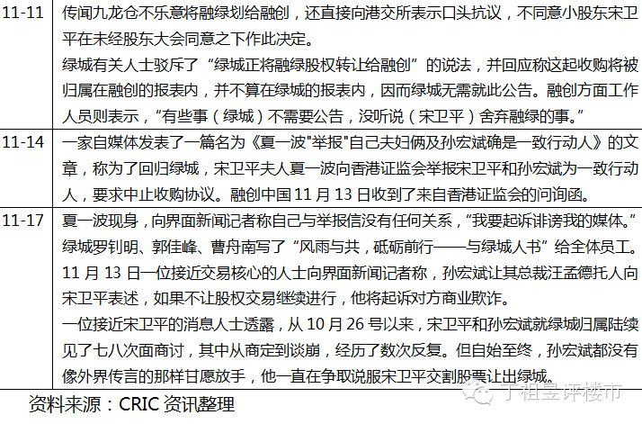 从10月下旬市场传言宋卫平要回归绿城之后,短短20天的时间,事件愈演愈烈,逐渐有从肥皂剧演变成狗血剧的趋势。上周更是爆出匿名信举报事件,甚至有矛头直指宋夫人夏一波。昨天又有夏一波开发布会澄清匿名事件,还有绿城三执董罗钊明、郭佳峰、曹舟南写了“风雨与共,砥砺前行——与绿城人书”给全体员工。更搞笑的是,老宋老孙尚未亲自对外发布任何消息,就有分属宋孙两派的媒体出来做传声筒,并逐渐文字中出现火药味。一场纯粹的商业行为,已经成为闹剧,白白让业内看笑话,再闹下去各家失分。