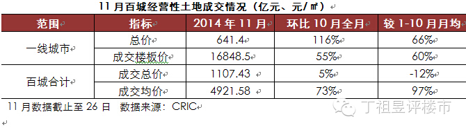 今天到11月结束还有四天,但截止至11月26日,京沪穗深等一线城市土地成交建面已较10月超出近四成,成交总价更是翻番。而从整体来看,随着一线城市土地市场的回暖,在高价土地的拉动效应带动下,本月成交均价也较年内平均出现了极大幅度的提升,成交总价也已经超过10月全月。