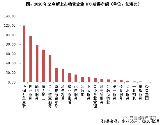 物管行业收并购的加剧,一定程度上与龙头物企完成了IPO导致的资金实力加强直接相关。2020年以来,新登陆港交所的物业服务企业达到21家,当中包括恒大物业、融创服务、世茂服务以及华润万象生活等规模较大的物企,这些企业的IPO所得净额都超过了60亿港元,其中华润万象生活更是超过了120亿港元。也正是由于这些大型物企的上市,导致2020年以来上市物企的平均IPO所得净额达29.06亿港元,几乎是2019年上市物企的平均IPO所得净额的三倍。而根据这些企业招股书中披露的募集资金用途,基本上60%左右的资金会用于收并购,因此IPO的成功直接给龙头物企的收并购补充了大量“弹药”。