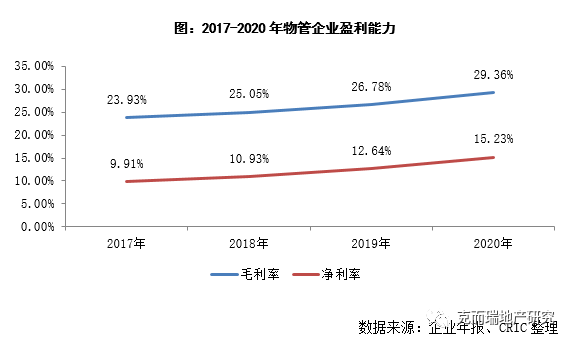 相比传统地产开发,物管行业现金流稳健,经营风险相对较低,同时盈利能力也较为稳定。从目前上市的物管企业2017-2020年的加权平均毛利率和净利率来看,近年来物管行业的毛利率和净利率都保持着稳步上升的态势。而由于物企的营收主要源于对已有项目收取的物业管理费以及增值服务的收益,因而对物企而言扩大其在管面积规模就等于增加营收和利润,这也是物管企业进行收并购的直接动力。