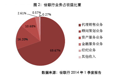 将和搜房网达成线上、线下的渠道和资源整合。搜房的主营业务包括四大模块:网络营销服务(主要为搜房网上的广告收入)、电子商务(搜房卡业务等)、搜房帮房源发布(主要针对二手房经纪人的房源发布和排名)和其他增值业务(包括研究、数据服务),全部为线上服务。而世联行的业务主要包括代理销售业务、顾问业务、资产服务业务和金融服务业务等,基本为线下业务,其中代理销售业务收入占总收入的67.67%。此次合作后,双方有望进行线上与线下的联动,对各自手中的资源进行整合。