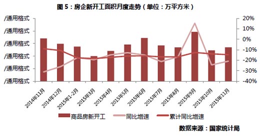 与房地产开发投资表现相同,四季度新开工投资增速表现依然低迷,增速维持在-20%左右,相比前三个季度,降幅有扩大趋势,新开工面积与市场新增供应量高度相关,新开工面积的持续回落,实际上代表着行业新增供应规模的下滑,表明目前企业对新增供应的谨慎。在一定程度上,2015年新开工大幅减少,未来供应会相应下滑,未来新增可售货量和可售货值减少。