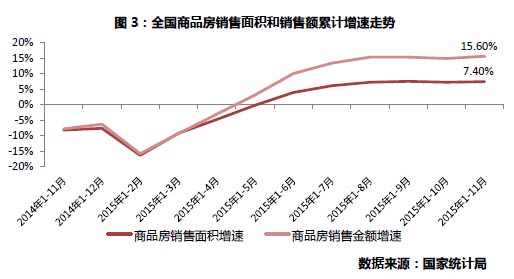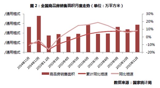 利好政策不断落地,促使改善型需求集中释放,今年商品房销售筑底回升。1-11月份,商品房销售面积109253万平方米,同比增长7.4%,增速比1-10月份提高0.2个百分点。 从全年走势看,在3月商品房销售降幅持续收窄,1-5月销售额同比由负转正后,三季度销售面积开始同比正增长,实现了2014年年初以来的首次双双正增长,四季度在政策刺激力度加码作用下,销售面积增速加速上行。