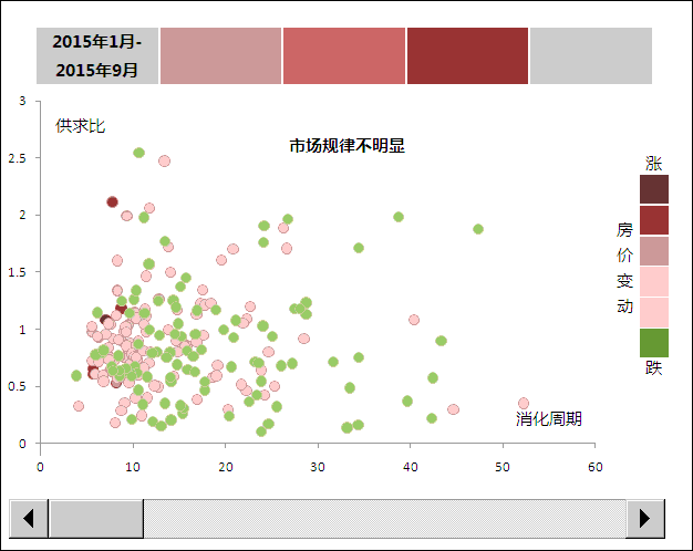 第一阶段,房价低速上涨(2015年10月至2016年2月)。监测城市房价环比仍是涨跌参半,不少城市仍在坚持去库存,消化周期对于价格的影响不大,供求比更多的呈现出正相关,即供应多的城市房价反而涨的更快。如2015年11月深圳住宅供求比1.4,房价环比上涨2.9%,三亚住宅供求比0.35,房价环比下跌0.3%。