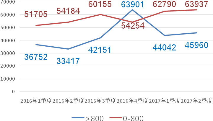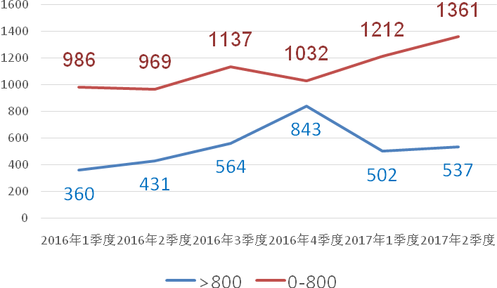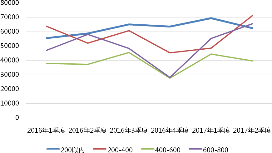 以单季度800来访量为界分析,可以看到来访量高的项目大多主打低总价、低单价的刚需产品,与其他项目存在着较为明显的差异。2017年二季度,高来访量项目均价为4.6万元/平方米、537万,而其他项目均价为6.4万元/平方米、1361万。在环线分布上也有明显不同,高来访量项目大多位于外郊环、外环外,而其他项目则多处于外环内和中外环。