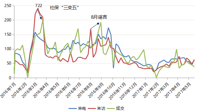 但在成交量收窄的市场周期中,来电、来访量并没有“先行下滑”,以2016年四季度为例,来电、来访、成交量三项指标均在同步回落,并没有出现某项指标先一步变化的情况。