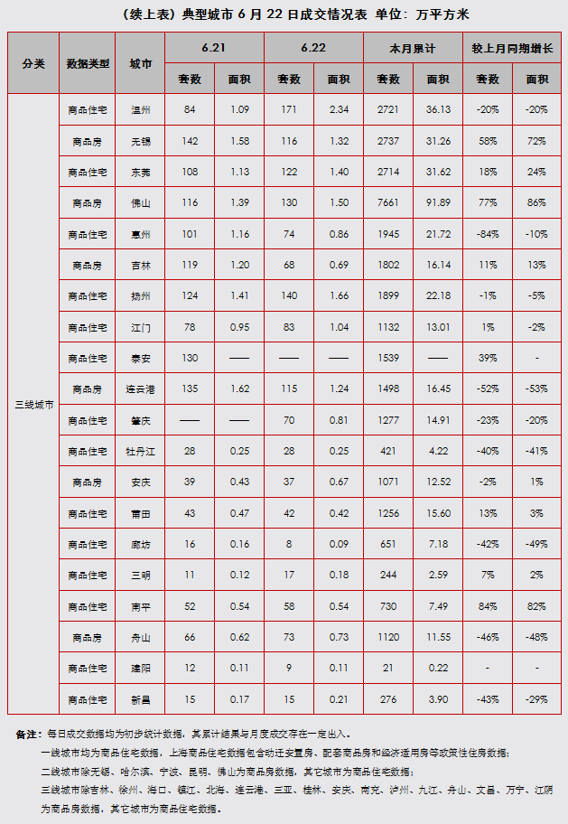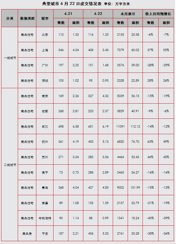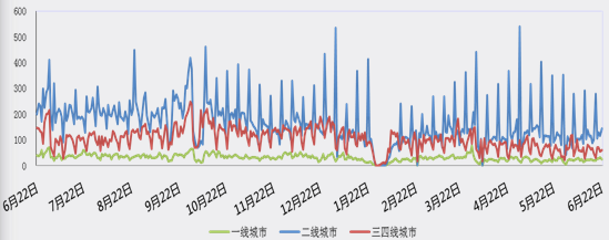 6月22日,一线城市成交指数为25.97,环比下跌5.84点,北京下跌6.26%;二线城市成交指数为143.40,环比上涨27.59点,青岛上涨20.12%;三线城市成交指数为60.55,环比下跌5.00点,东莞上涨24.68%。二、三线城市成交指数较昨日上涨。