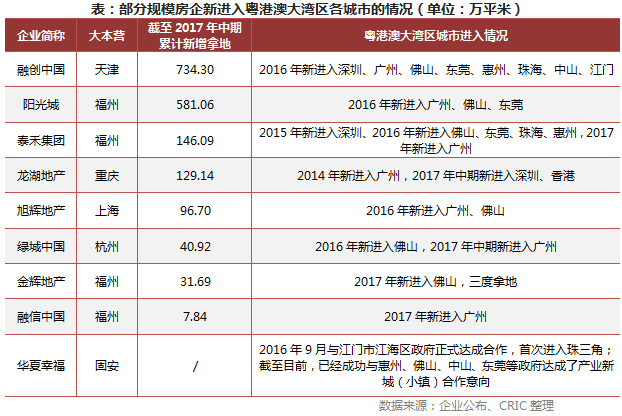 这些企业持续深耕大本营,同时也在积极进入区域内其他城市,如华润置地,2016年2月首进珠海,计划斥资177亿元在横琴自贸区建设其首个国际化商贸综合体万象世界;恒大2016年首入肇庆,截止2017年6月30日,已通过招拍挂和收并购成功获取4个项目,分别为恒大世纪梦幻城、恒大翡翠华庭、恒大团星鼎峰和恒大御湖城。