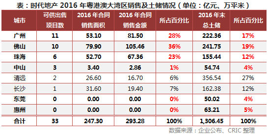 时代地产在湾区土储量最大,截至2016年末,其在粤港澳大湾区储备总建面约787.52万方,占集团总土储比例为60.28%,其中广州、佛山、珠海、中山也是集团销售的主力支撑,2016年四地实现总合约销售金额为257.18亿元,贡献率达87.69%;而东莞和惠州作为其新进入的城市,目前尚未创造收益,但随着湾区利好政策的推动,后期也有望助力其业绩更上一层楼。