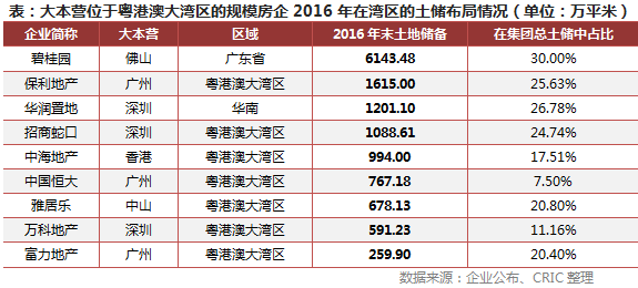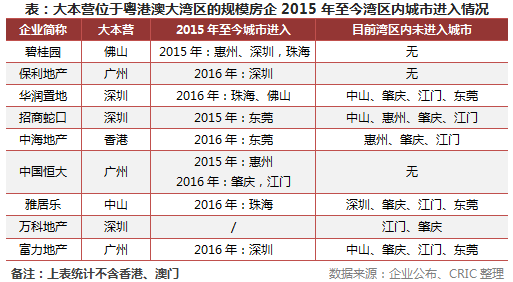 粤港澳大湾区所涵盖的佛山、深圳、广州恰好是目前房企龙头——碧桂园、万科和恒大的发源地。事实上,华南区域也是诸多老牌房企的大本营,许多企业都是以此为原点,开始了全国化规模扩张,如保利、华润、招商、富力等等。
