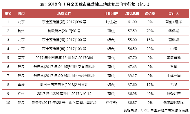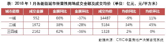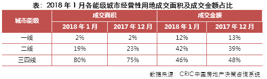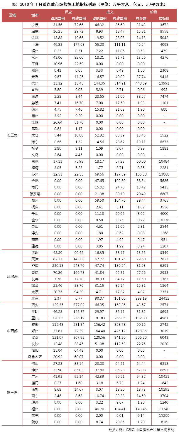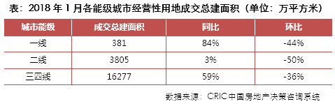 2018年1月,土地市场由传统高峰期转入淡季,土地成交规模环比显著下降,但由于2018年春节来临较晚,同比指标依旧保持增长。租赁房用地在更多城市加快落地,如合肥首宗租赁用地在月内成功出让,南京于1月份推出了五幅租赁住房用地。