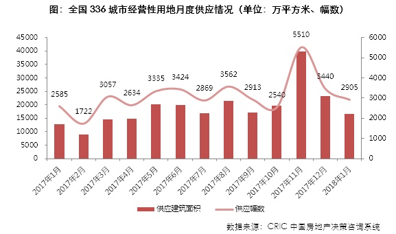 2018年1月份,全国330城市经营性土地供应环比进一步下降,供应建筑面积16726万平方米,幅数2905幅,环比分别下降28%和16%,虽然环比持续走低,但供应量较去年同期仍然有所上涨,主要由于去年春节假期在1月份,对于土地市场影响较大,而今年土地市场供应的最低点预计将出现在2月份。