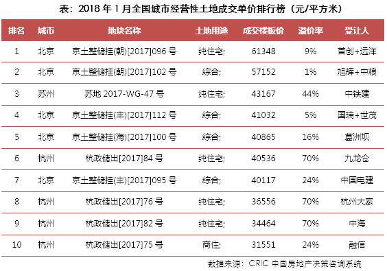 2、单价排行榜:北京地块占据半壁,榜单整体提升显著