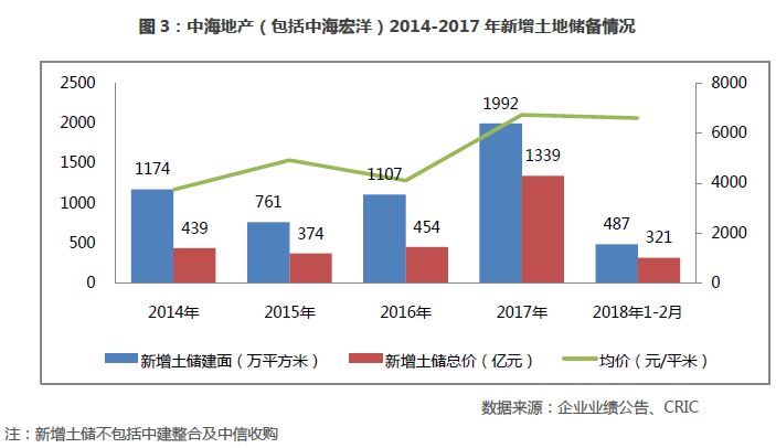 随着一系列整合尘埃落定,2017年中海地产在公开土地市场上也变得更加积极。2017年中海地产(不包括中海宏洋)在内地和香港32个城市,共新增拿地建筑面积为1741万平方米,总计拿地总价为人民币1245亿元。此外中海宏洋新增建筑面积为251万平方米,拿地总价为人民币94亿元。2018年中海将继续保持积极的拿地态度,计划新拿地权益投资额港元1350亿元,同比增长22%。2018年前2月,中海地产(含中海宏洋)已新增建筑面积487万平方米,拿地总价达到了321亿元。
