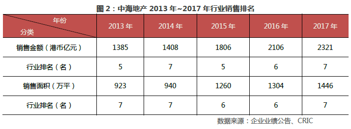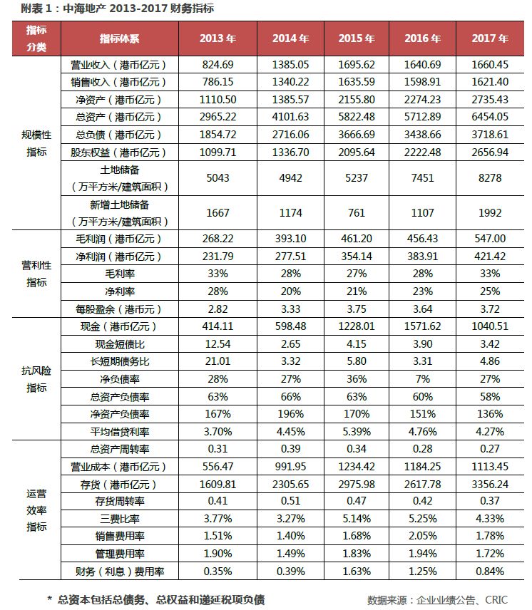 2017年中海地产(含联营合营公司)共实现合同销售金额为港币2321亿元,同比增长10%;合约销售面积1446万平方米,同比上涨11%;其中内地销售为港币2201亿元,占比95%。从历年来看,中海地产的销售规模增长都较为缓慢,前4年的复合增长率仅约为14%,落后于同等规模的房企,这可能跟过去几年中海的整合变化较多所致。