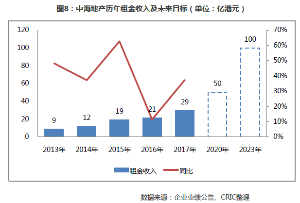 2018年中海销售目标稳中有进,同比增长25%达到2900亿港币。在商业领域也制定了租金收入三年港币50亿,六年100亿的目标。此外养老、教育、物流等等领域,都可见中海积极布局的身影。