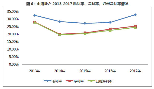 2017年中海地产的盈利水平再上一个台阶,毛利率达到了32.94%,较2016年增长了5.12个百分点;净利率达到了25.38%,较2016年增长了1.98个百分点,核心净利润率为19.55%,同比上升了4.19个百分点。之所以中海地产利润率较高,一方面是因为其在项目选择上更为注重利润空间,此外中海也有从项目拿地到开发建设的全产业链业务,从而能够更好地控制成本。2017年中海的三费费用较往年也有所缩减,三费费用率仅为4.33%,相比2016年的5.25%下降了0.92个百分点。利润的注重、成本的控制以及较低的三费费用率,得以让中海的盈利水平维持在较高水平。