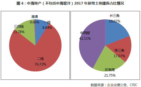 从拿地结构来看,2017年中海地产(不包括中海宏洋)主要于中西部的二线城市拿地较多,其中成都、西安是拿地最多的两个城市,成都的新增拿地达到了243万平方米,占到了新增拿地总额的14%;西安的新增拿地达到了188万平方米,占到了新增拿地总额的11%。
