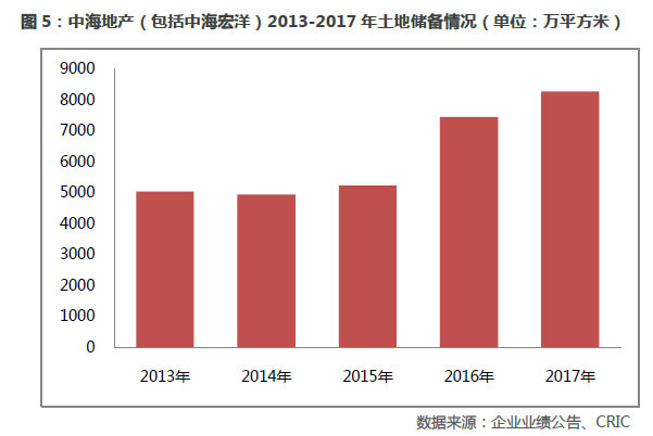 截止2017年底,中海地产的土地储备达到了6375万平米,同比增长12%;而中海宏洋的土地储备为1903万平米,同比增长7%。中海目前已拥有总土地储备8278万平方米,可供企业未来3到4年持续增长的需要。
