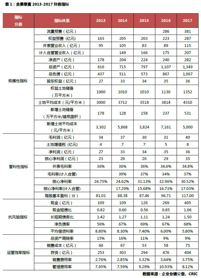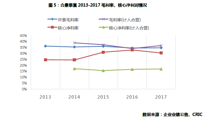 无论是否考虑合营项目, 公司在行业内维持着极高的毛利率(2017年并表: 34.8%; 计入合营: 36.7%)及核心净利润率(2017年并表: 30.5%; 计入合营: 17%), 这在近年土地及建安成本上升, 预售价格受限的大背景下, 实属难能可贵。