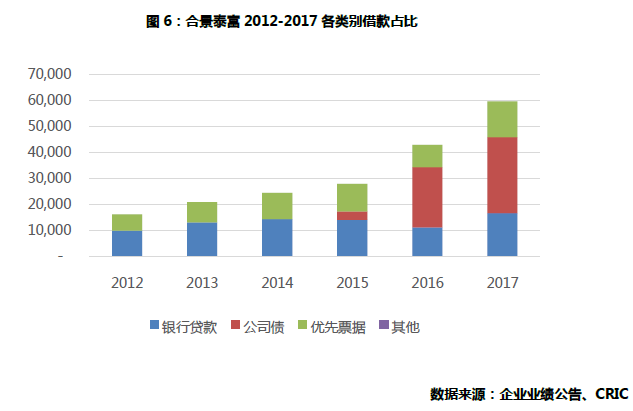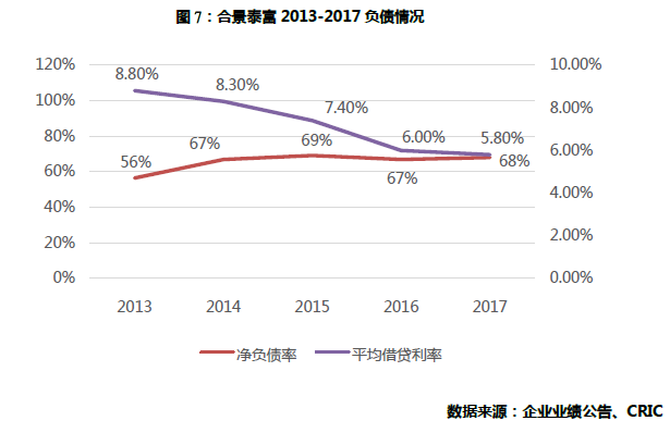 2017年公司的借贷情况在行业内属于稳健水平。得益于近年公司债的发行, 公司并未因大规模拿地而导致财务成本上升。2017年公司平均借贷水平为5.8%, 同比下降0.2个百分点。净负债率维持在68%的水平, 同比上升1个百分点。