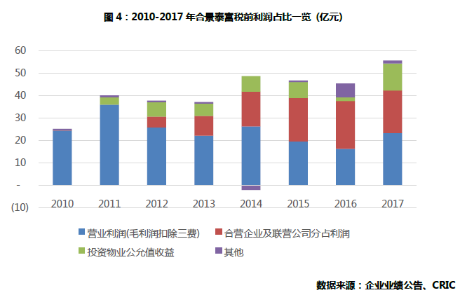 如图所示,2017年合景泰富税前利润中公允值的占比激增, 然而公司计算的核心净利润率(已剔除公允值)却同比增长20.6%。这有可能由于公司提前偿还高息债及扣除境內公司債券汇兑损失的影响后的结果, 亦有可能在合营项目层面有公允值损失被调整回来。