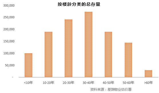 根据香港物业报告公布的最新统计数字, 2017 年年底私人住宅的整体总存量为 1,174,628 个单位。当中54.6%的楼龄超过30年, 其中以油旺区的楼宇老龄化最为严重, 3,345座楼宇中50%楼宇超过50年楼龄, 80%楼宇超过30年。