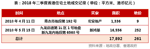 土地成交方面,香港政府第二季度推出的两幅住宅地皮,均由本地发展商投得。其中宏安地产以9亿港元投得青衣一地皮,平均楼面尺价8,491港元。新鸿基集团以252亿港元总价投得九龙启德区地皮,成为2018年开年以来地皮成交的新地王。相比于2017年政府标售的土地有70%是由中资发展商投得,港企在2018年的投地策略十分进取。
