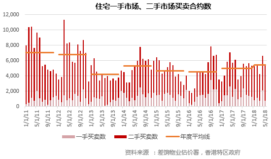 从2018年第二季度住宅交易情况来看,一手住宅在经历2月和4月的买卖宗数和价值高峰之后出现回落,5月仅录得交易宗数756宗,尚不足4月交易宗数的四成。这反映出第二季度缺乏大型新盘开售,只有新盘货尾推出,使得与一手住宅交易显著回落。二手住宅交易市场持续火热,5月录得交易宗数4766起,创2015年起三年新高,总价逾389亿港元,相比起4月的4524起以及352亿港元分别上升5.3%及10.5%,反映4月期间二手楼市气氛向好,市场缺乏新盘开售,令购买力回流二手市场,带动二手住宅持续火热。