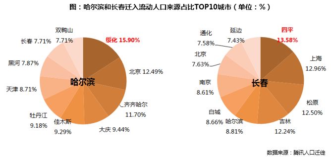 在两个城市流动人口来源比例TOP10中,排名第二的城市均是一线城市,占比也都在12%左右。但相对于哈尔滨,拥有一汽和北车等著名企业的长春对一线城市及热门二线城市的人才吸引力更强,其流动人口中来源于这些城市的比例近三成。
