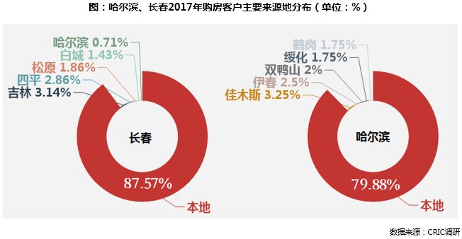 进一步地,从两市的购房客户来源地分布情况来看,哈尔滨显然比长春对外地客户的吸引力更大。根据克而瑞调研数据显示,两地的购房客户都主要来自于本地,但在长春购房的本市客户比例高达87.57%,而哈尔滨则为79.88%,外地客户占比高出前者约8%。
