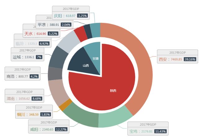 图:2017年关中平原城市群各城市GDP及占比(单位:亿元,%)