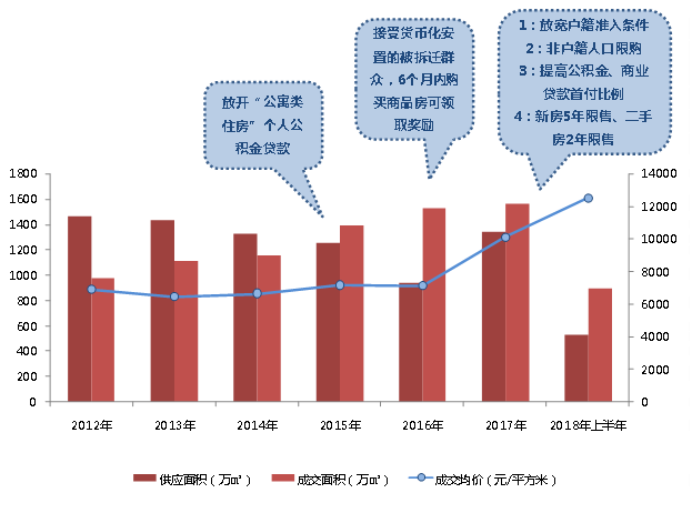 在本轮市场热度的带动下,商品住宅的成交均价大幅上涨,2017年商品住宅成交价均价突破1万元/平方米,相比2015年成交均价7165元/平方米,3年复合增长率达到12.21%;2018年上半年商品住宅均价已经达到12520元/平方米,成交体量也达到近900万平方米,已经超过2017年总成交面积的一半,市场显然呈现“越限越热”的走势。