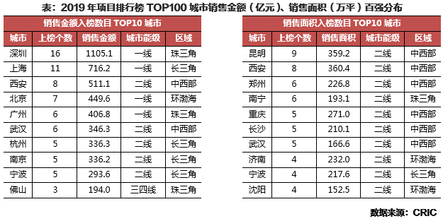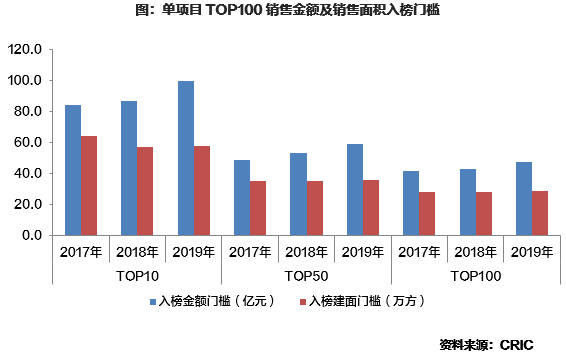 面积榜数据同比去年变化不大:门槛方面,2019年热销项目排行榜面积百强门槛为28.9万平,与去年相比基本持平;百万平大盘数量上,今年同样仅有1个项目销售突破百万平,重庆融创文旅城凭借115.3万平的销售面积登顶,相比去年榜首上升10.7万平。