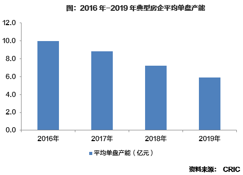 项目间的业绩差缩小,企业间的竞争愈加激烈。2019年TOP100房企权益金额增长率仅为6.5%,降幅明显。从单项目榜单来看,项目间的业绩差也在明显缩小,典型房企2019年单盘产能相比2016年下降了40%,竞争压力可见一斑。