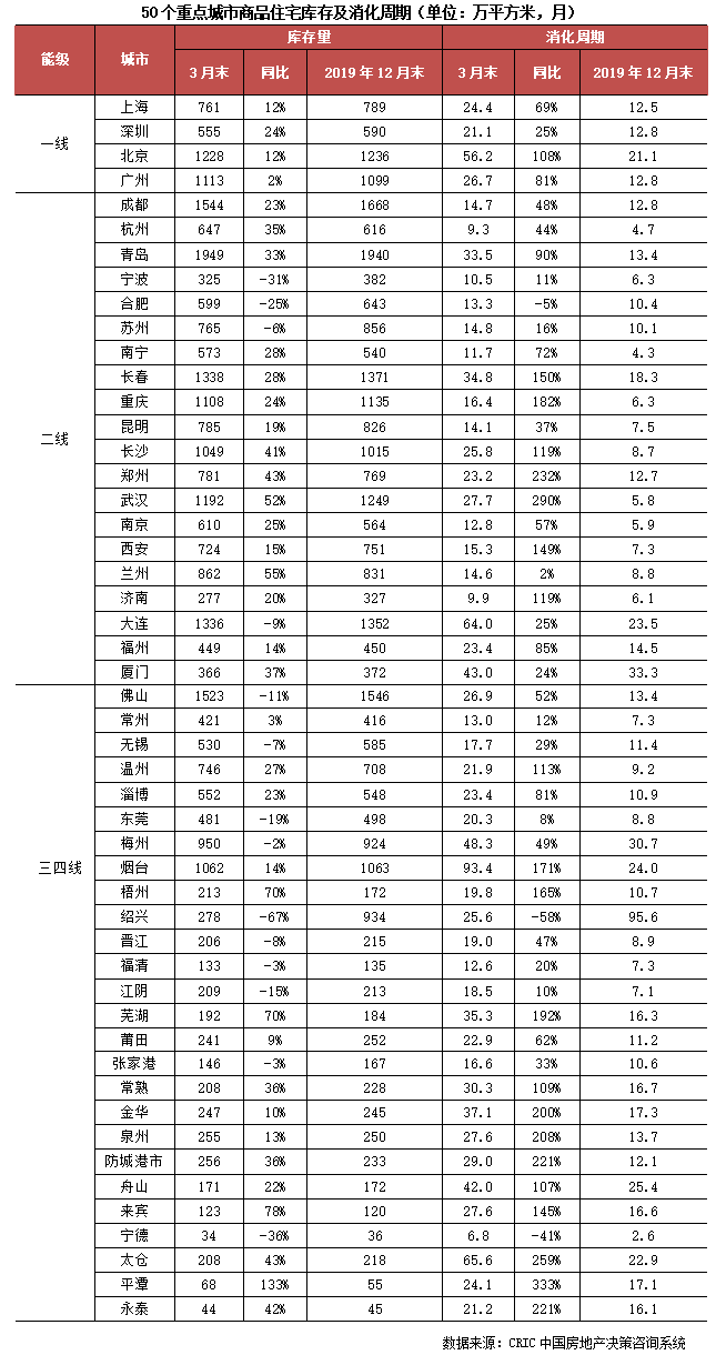 2020年一季度,七成以上城市库存同比明显扩容,梧州、芜湖等城市库存量近乎翻番。疫情期持续低迷的成交量也导致超九成城市消化周期攀升,六成以上城市消化周期一举跃升至18个月以上高位。预计随着疫情影响逐步散去,热点城市成交或将迎来反弹行情,预计二季度一、二线城市库存将有所回落,但三四线市场库存仍可能继续扩容,未来去化压力不容小觑。1、七成城市库存同比扩容,成交低迷致使九成城市消化周期上升(本节有删减)截至3月末,50个重点城市商品住宅库存量30432万平方米,同比2019年3月末增幅高达11%。尽管1月中旬爆发的新冠肺炎疫情导致各地售楼处停业、项目停工、房企延迟复工,使得部分城市楼市出现短期供需缺口,苏州、宁波热点城市等库存量环比收缩超超10%。但从同比来看,整体库存量仍在不断攀升,七成城市库存同比有所扩容,梧州、芜湖等库存近乎翻番。受疫情导致市场停摆、成交下滑影响,各地商品住宅消化周期明显拉长,九成以上城市消化周期同、环比齐升,33个重点城市消化周期一举跃升至18个月以上高位,其中北京、大连、厦门、烟台、梅州等7个城市消化周期已超40个月,库存压力不断积聚。2、商品房待售面积同比由跌转增,住宅待售面积较2019年末激增3224万方(略)3、展望:一、二线城市库存持续回落,三四线市场库存或将继续扩容近两月,为纾困房企、恢复楼市,多地政府出台了针对房地产行业的扶持政策,譬如降低预售取证标准等,都将有效引导提升二季度房企推货意愿和推货节奏。就需求端来看,随着疫情影响逐步散去,购房者信心将有明显提升,前期积压的购房需求将稳步释放。在供求两端共同发力的情况下,预计二季度各城市库存量呈现波动分化。具体来说,一、二线城市库存量或将出现小幅回落,由于供给恢复一定程度上还受到项目施工进度影响,而因疫情延误的工期进度一时间很难回补,但需求复苏相对灵活,尤其是深圳、成都、苏州等城市,楼市已然出现局部过热迹象,短期内供不应求形势恐难逆转,最终将有效消化现有库存。而三四线城市二季度库存量仍可能继续扩容,一方面,此前积压的返乡置业需求很可能随着返城复工而延期甚至消失,另一方面,前期积压的供应将在二季度集中入市,或让楼市重回“买方市场”,加剧购房者观望情绪。事实上,三四线楼市承压之大、去库存之难,从近期江门、泸州等三四线城市购房补贴、取消限购等“救市”政策频出也可窥见一二。
