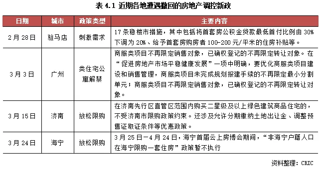 一季度,受疫情影响,货币、财政政策同步转向积极,央行两度降准,释放长期资金约1.35万亿元。不过,稳健的货币政策仍将贯彻执行,坚决不搞“大水漫灌”式强刺激,坚决遏制房地产金融化泡沫化。随着LPR利率中枢适度下移,3月全国房贷利率加速下移,首套、二套房贷平均利率分别降至5.45%和5.77%。地方多措并举为市场、企业减压,涉及支持企业复工复产,调降土地出让门槛,放宽预售条件,人才政策继续发力,购房补贴、税费减免,调降首付比例等。不过,部分省市调控政策再升级,唐山落地限售,海南省升级全域限购政策,并实行现房销售制度。展望未来,2020年房地产信贷政策中性偏积极,房企融资环境或将分类放松,大中型品牌房企或将明显受益,融资成本有望适度下移。居民部门仍需稳杠杆,确保居民杠杆率和负债率不再继续上升,压力城市限贷政策或将适度松绑,放松优先级按照公积金、房贷利率、首付比例依次递减。地方“因城施策”,一线以及热点二线城市调控政策仍需从紧执行,厦门、宁波、台州、珠海等压力二三线城市或将放松调控,上饶、岳阳等弱三四线城市更可能刺激购房需求。1、短期货币、财政转向积极,但坚决遏制房地产金融化泡沫化(本节有删减)1月2日至3日,央行召开工作会议,部署2020年7项重点工作。其中,首要任务仍是稳健的货币政策,但表述已由2019年的“松紧适度”变为“灵活适度”。鉴于2020年是防范化解金融风险攻坚战的收官之年,遂将“坚决打赢防范化解重大金融风险攻坚战”列为第二项工作任务。另外,会议首次提出“加快建立房地产金融长效管理机制”。受困于春节假期新冠肺炎疫情加速蔓延,节后央行密集通过逆回购、MLF等融资工具向市场投放流动性。2月3日,央行创纪录地开展1.2万亿元逆回购操作,并在短短两周内央行向市场投放巨额流动性达3万亿元,明确释放货币政策转向积极的信号。3月30日,央行开展500亿元7天期逆回购,中标利率下调20个基点至2.2%。一季度央行两度降准,释放长期资金约1.35万亿元。1月6日,央行全面降准0.5个百分点,释放长期资金约8000亿元。3月16日,央行对达到考核标准的银行定向降准0.5至1个百分点,并对符合条件的股份制银行再额外定向降准1个百分点,共计释放长期资金约5500亿元。2月21日,央行召开2020年金融市场工作会议,充分肯定了2019年金融市场和信贷政策工作所取得的成绩,并部署2020年6大重点工作。就房地产而言,要求保持房地产金融政策的连续性、一致性和稳定性,继续“因城施策”落实好房地产长效管理机制,促进市场平稳运行。而从央行发言人表态来看,2020年央行将继续实施稳健的货币政策,保持灵活适度,坚决不搞“大水漫灌”。不难看出,短期货币、财政政策同步转向积极,仅是应对疫情期间经济短期下行压力的必要措施,并非代表货币政策根本性转向,稳健的货币政策仍将贯彻执行,坚决不搞“大水漫灌”式强刺激,尤其要避免信贷资金过度流向房地产市场,坚决遏制房地产金融化泡沫化。2、3月房贷利率加速下移,存量房贷利率转换取决于LPR升降预期(略)3、地方多措并举为市场、企业减压,唐山、海南调控再升级(本节有删减)疫情期间地方房地产政策层面呈现两阶段变化:其一,100余城暂停案场销售活动,房地产市场急速冷冻;其二,多省市积极为开发企业解困,并刺激需求维稳房地产市场。具体而言:受困于疫情不断蔓延,中国房地产协会发出号召,暂停售楼处销售活动,待疫情过后再行恢复。随后,北京、南京、合肥等100余城纷纷跟进下发通知,明确要求暂停售楼处销售活动,房地产市场急速冷冻,三四线城市返乡置业潮全面爽约。典型如南京,严令全市所有商品房项目和开发企业暂停举办发布会、答谢会及开放、登记报名、认购、开盘等各种形式的群体性活动。疫情期间地方政策热闹纷呈,积极为开发企业解困,主要集中在以下3个方面:其一,广州、青岛、厦门、苏州等多城支持企业复工复产,力争将疫情的负面影响降到最低,涉及简化项目复工手续办理,推动重点工程、重大项目全面开工,奖励企业招工等。即使疫情最为严峻的武汉,现已实行差别化分批复工复产,有序开展线上线下营销活动。苏州复工政策最为给力,实施集中返岗包车补贴,包车费用由市、县两级给予用工企业50%的补贴。石家庄则对招用毕业2年内高校生、去产能企业失业员工、登记失业半年以上人员的企业,给予每人1000元标准的就业补贴。其二,调降土地出让门槛,缓解房企拿地时的资金压力,涉及降低竞买保证金,延期或分期缴纳土地出让金,顺延项目开竣工期限等。典型如西安,新出让土地按起始价的20%确定竞买保证金,合同签订后一个月内缴纳50%的土地款,余款可在一年内分期缴纳。其三,放宽预售条件,全力支持企业促销售、抓回款,涉及顺延项目预售期限,调整预售审批标准,放松预售资金监管等。典型如苏州,取消结构性封顶现房销售,已成交需要结构封顶或现房销售的地块,可以提前入市。又如河南鹤壁市,多层建筑进度正负零、小高层完成地面1层、高层完成地面2层施工即可办理预售。与此同时,多城市更在需求端刺激,维稳房地产市场,集中体现在以下3个方面:其一,人才政策继续发力,政策内容不断升级,涉及调降人才落户门槛,享受户籍人口购房政策等。典型如苏州,全面放宽落户标准,本科以上学历人才可直接申请