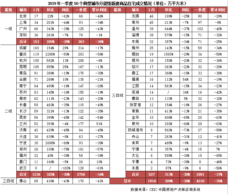 2020年1-2月79个城市成交量情况(单位:万平方米)(略)2、3月环比增3倍使得一季度同比跌幅收窄至35%,核心二线“复苏”显著因新冠疫情在国内已得到初步控制,供应稳步放量,3月楼市成交有了显著回升。50个重点城市3月整体成交1916万平方米,环比增长309%,同比仍跌30%。整体一季度成交“先抑后扬”,1-2月多数城市近乎为0成交,3月小幅放量,50城一季度成交同比去年仍下跌了35%。分能级来看,一线城市一季度成交为363万平方米,同比下降36%。其中北京跌幅最大,同比下跌了46%,3月市场小幅回暖,但是成交绝对量依旧偏低,仅为17万平方米,环比小幅增长22%,同比大降62%,主要源于北京整体的供应仍属低位,经历了去年年末需求的集中释放,当前刚需观望情绪仍比较浓厚。深圳市场复苏相对较快,今年一季度成交仅同比微跌1%,得益于外来务工人员基本已经返程,近期商务公寓屡开屡罄:3月7日,104套总价区间在2000万-5000万的太子湾云玺房源当日售罄;3月16日,万科星城288套小户型公寓开盘七分钟全部售罄。预期后续刚需、改善需求仍有望持续平稳的释放。二线城市一季度总成交2756万平方米,同比下降34%,与一线和三四线相比,跌幅最小。从绝对量层面,成都、重庆、杭州都迎来了疫情后需求的集中释放,1-3月成交量均超200万平方米,典型代表如成都,近郊的江口水镇项目3天到访量超千组;节后“万人摇”项目重现——恒大天府半岛中签率不足1.5%。与之形成鲜明对比的是,武汉重灾区疫情负面影响犹在,3月仍为0成交,一季度成交量同比去年下降6成。单3月环比来看,二线城市集体“飘红”,部分城市诸如重庆、宁波环比增幅均超2000%,主要源于上月基数过低的缘故。单3月同比来看,多数城市城市仍未恢复至去年同期水平,近成都、杭州、昆明、合肥3月稳步放量,同比出现了正增长。三四线城市一季度成交1091万平方米,同比下降37%,跌幅最为显著。主要源于新冠疫情下,三四线返乡置业爽约,据CRIC测算,2020年返乡置业“受损量”约800万平方米和600亿元;加之多数三四线城市经历了前2年的房价翻番,购买力基本都已透支,整体成交相对低迷也在预料之中。其中东南沿海长、珠三角城市因疫情相对较轻,加上防控到位,成交抗跌性良好,诸如常州、绍兴、福清、江阴一季度累计同比降幅均在2成左右,宁德同比甚至上升了7%。3、展望:二季度一、二线成交将企稳回升,三四线持续分化下行综上,在新冠疫情的“阴霾”下,一季度楼市成交大幅回落已成定局,不过随着国内新冠疫情得到了初步控制,房企陆续复工,加之各地出台了多种为企业纾困的良策,3月楼市也出现一些转暖征兆:一方面房企加快了推盘节奏,供应小幅放量,二三线的推盘节奏明显快于一线;另一方面成交也有了稳步增长,尤其是核心一二线城市诸如深圳、苏州、成都等项目热销频频,市场转暖迹象显著。基于此,我们认为,疫情对楼市的负面影响将会逐月递减,二季度成交会稳步回升,整体表现也会略好于一季度,具体来看:一线城市成交量有望小幅回升。事实上,当前一线楼市已然有一些复苏征兆:北、上地市大热,房企拿地热情高涨,上海徐汇滨江180万平方米超大体量绝版地块,由28宗地块组成,整体投资金额或将达到700亿元。最终由香港置地联合体底价310亿元摘得,创造上海新的总价地王纪录。深圳多盘热销,商务公寓屡开屡罄:3月7日,104套总价区间在2000万-5000万的太子湾云玺房源当日售罄;3月16日,万科星城288套小户型公寓开盘七分钟全部售罄。由此可见,大市低迷的背景下,核心城市的投资价值正在日益凸显,客户观望情绪转淡,购房信心增加。二季度若供应持续放量,成交量将保持小幅回升态势。二线城市成交有望企稳回升,尤其是东南沿海核心二线,成交表现将持续转好。主要源于一方面当前市场本就处于疫情过后的快速恢复期,此前我们的调研数据也显示,74%的购房人群选择延后置业而非取消,前期被压抑的需求集中释放造成成交在短期内快速回升基本符合预期;另一方面2020年开年以来,各地为对冲疫情的负面影响,中央和地方各类刺激政策不断涌现,尤其是楼市信贷微调被默许,叠加外部新一轮量化宽松,先知先觉的购房人开始不淡定,乐观预期被强化。具体来看,首先,长三角的部分城市诸如南京、苏州、杭州等城市成交有望率先企稳回升,高性价比项目将持续热销;诸如苏州3月20日开盘的碧桂园伴山澜湾雅苑、龙湖首开湖西星辰、中旅名门府和3月22开盘的龙湖大境天成项目,无论是线上销售还是线下选房的项目,几乎都是“秒光”;南京产登记中心更是在3月1日到24日,线上线下共计开出15742份购房证明。其次,沈阳、大连、济南等环渤海城市受疫情影响相对较小,楼市恢复较快,二季度成交有望保持稳中微增;最后,中部城市诸如重庆、武汉、长沙等城市疫情负面效应尚未消弭,整体成交有望在二季度末逐步恢复如常。三四线城市市场回调压力巨大,各城市间分化也会持续加剧。从目前的市场轮动周期来看,部分三四线城市由于房价已经上涨至阶段性高位,购买力已近乎枯竭,加上货币化安置比重逐渐减少,成交量势必会受影响,尤其是中西部一些经济基础较差、产业发展落后、人口持续净流出三四线城市成交有可能会大幅下滑;另一方面环都市圈三四线因人口外溢、产业承接等因素具备长期发展前景,典型代表诸如常州、无锡、南通、徐州、嘉兴