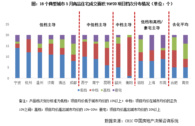 将5月成交同环比齐增且增幅显著的16个城市的商品住宅成交面积TOP20项目按照低档、中档、高档、豪宅进行了产品分类,各城市项目档次分布情况如下图,可以看出,以宁波、杭州、温州、济南、清远、成都为典型代表,刚需客户较为活跃,价格相对适中的高性价比中低档楼盘持续热销。加之部分区域因政府限价原因一二手倒挂,不乏一些高性价项目获得购房者的青睐。