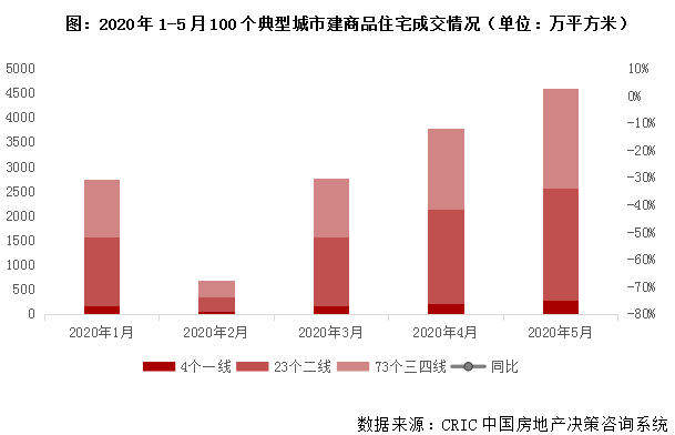 100个典型城市2020年前5月商品住宅成交面积总计14547万平方米,同、环比分别下降21%和33%。从月度走势来看,成交呈现先抑后扬态势,2月受困于新冠肺炎疫情的爆发,成交面积降至历史低位,3月疫情逐渐得到控制,成交大幅反弹,4、5月楼市稳步复苏,成交面积环比增速皆在30%左右,5月单月成交面积同比已由负转正,基本恢复至疫前水平。