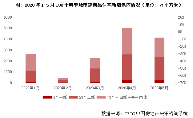 100个典型城市2020年前5月新增商品住宅供应面积总计14408万平方米,同、环比分别下降18%和45%。从月度走势来看,供应呈现先降后升再走稳趋势,2月疫情在全国范围内爆发,多地商品住宅供应归零,3月以来,房企加速推货,供应逐步放量,4月供应继续发力,实现同比回正,5月供应有所回调但仍基本与去年同期持平。分能级来看,一、二线供应占比明显回升,三四线城市总供应占比有所回落。